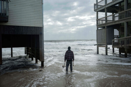 A worker who is reinforcing a home at risk of falling into the ocean looks out toward the waves as a storm approaches Friday, Oct. 10, 2025, in Buxton, N.C. (AP Photo/Allison Joyce)