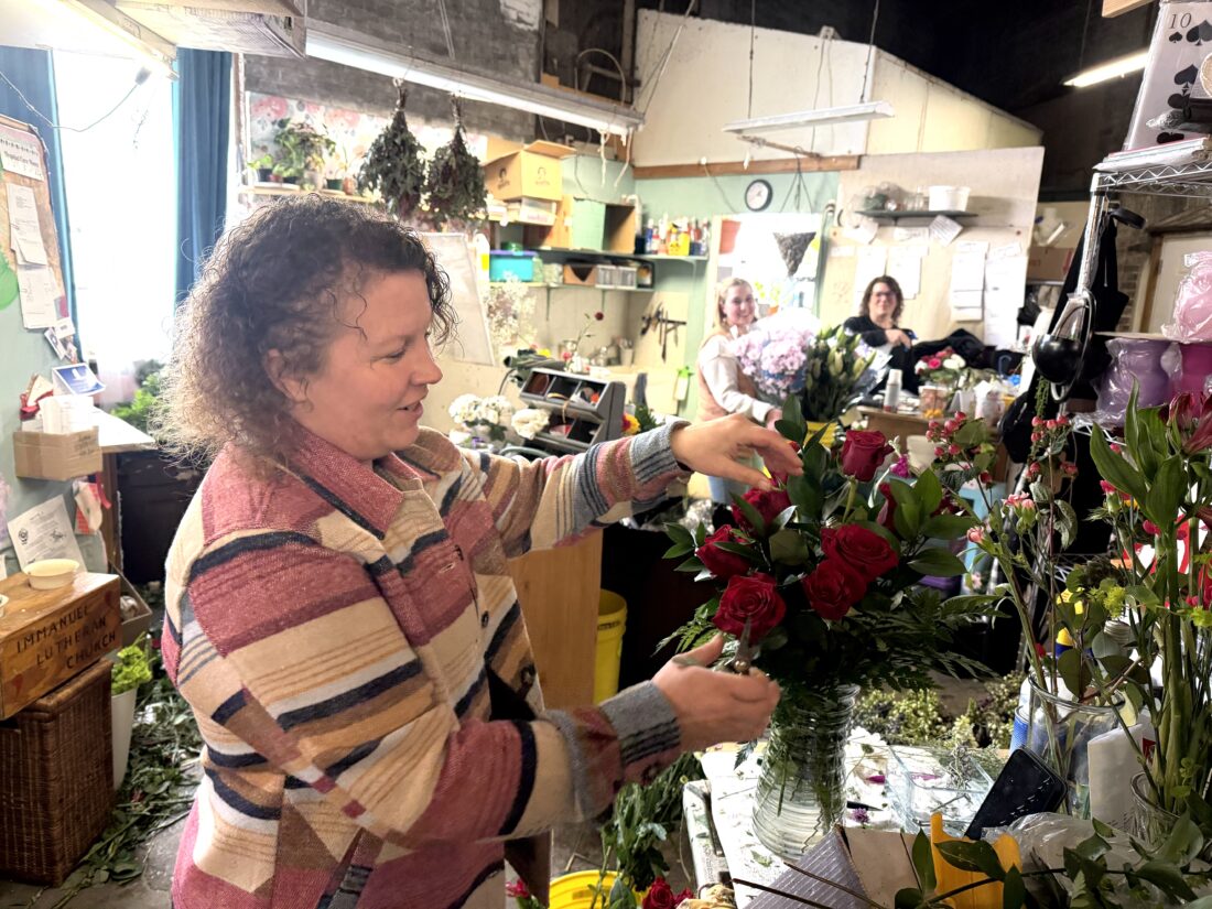 News photo by Kayla Wikaryasz On Friday, from left, Tara Wilson, Alexa Blumenthal, and Hope Ludwig are seen putting together flower arrangements at Wilson’s Lasting Expressions in Alpena. Community members visited the flower shop throughout the day to purchase arrangements ahead of Valentine’s Day.