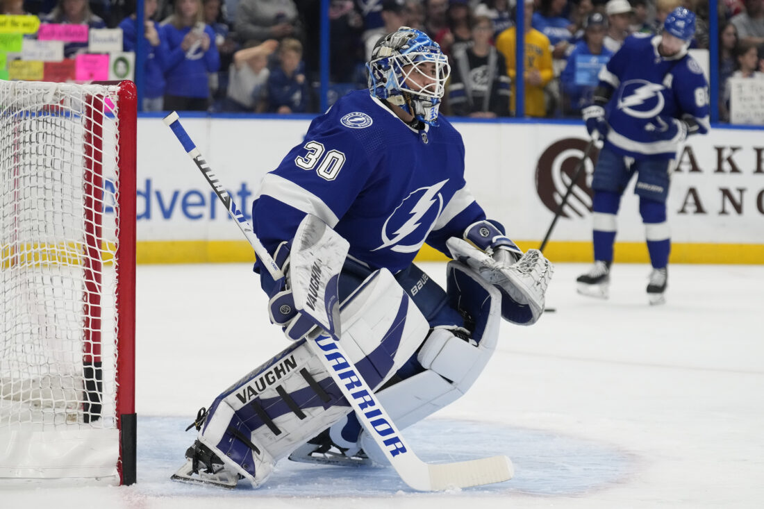 Tampa Bay Lightning emergency backup goaltender Kyle Konin warms up before an NHL hockey game against the Detroit Red Wings, April 1, 2024, in Tampa, Fla. (AP Photo/Chris O'Meara, file)