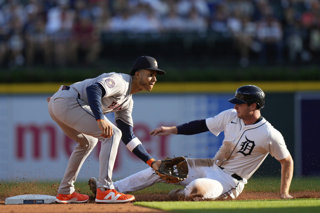 Detroit Tigers' Colt Keith, right, slides against Houston Astros shortstop Jeremy Pena, left, to steal second base during the first inning of a baseball game, Monday, Aug. 18, 2025, in Detroit. (AP Photo/Ryan Sun)