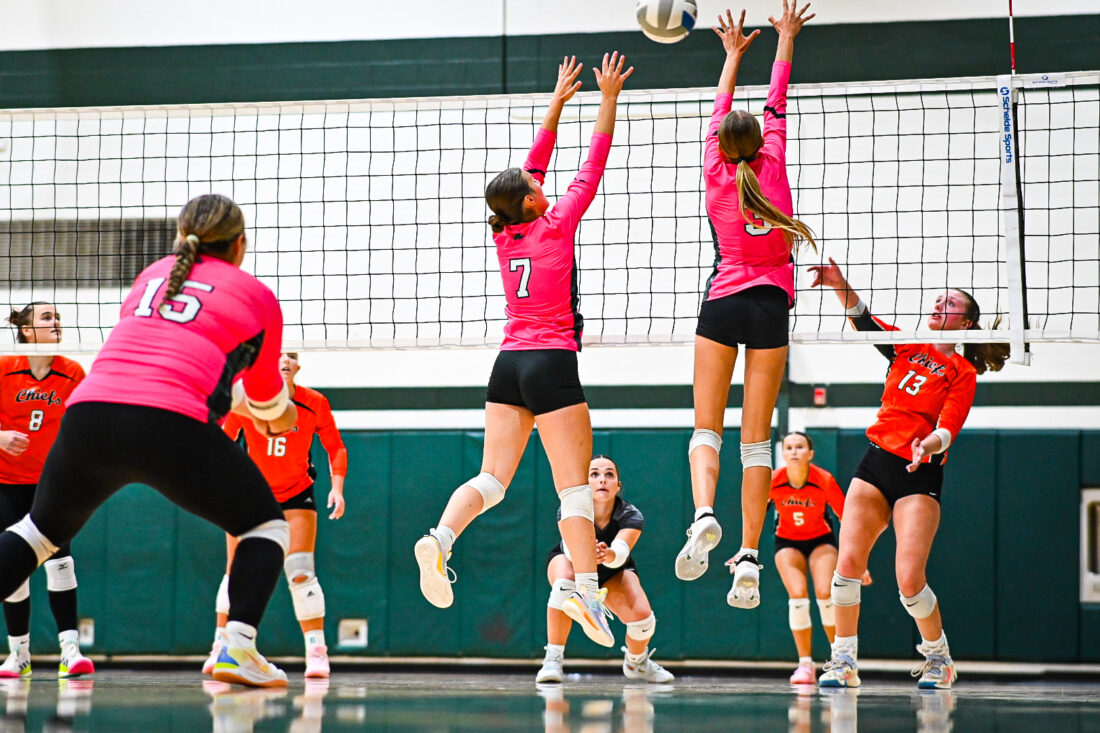 News Photo by Leslianne Johns Lilly Rospierski and Grace Cameron block the ball on Thursday in a home tournament at Alpena High School.