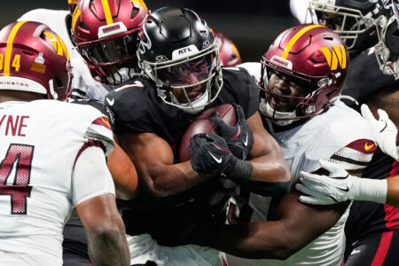 Atlanta Falcons running back Bijan Robinson, center, is tackled by Washington Commanders defenders during the first half of an NFL football game, Sunday, Sept. 28, 2025, in Atlanta. (AP Photo/Brynn Anderson)