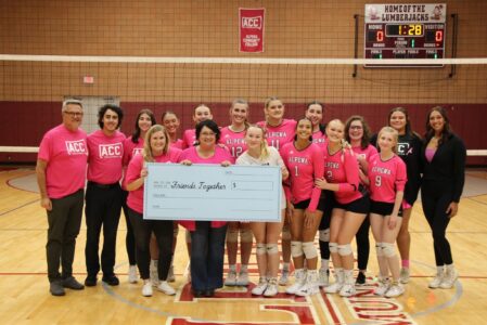 Although the Lumberjacks didn’t come away with the result they hoped for, the gym was packed in pink, the energy was high, and the effort matched the occasion as the college students and fans honored both its sophomore class and the fight against breast cancer.