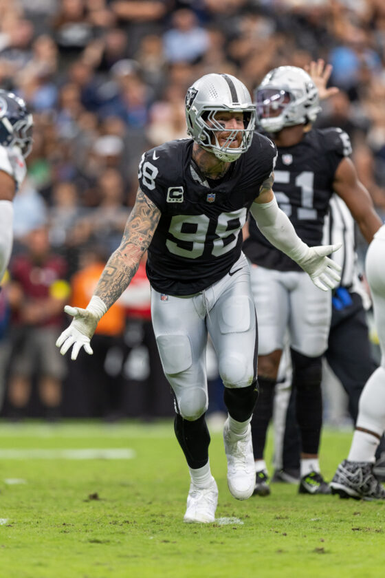 Las Vegas Raiders defensive end Maxx Crosby (98) reacts after a sack against the Tennessee Titans in an NFL football game, Sunday, Oct. 12, 2025, in Las Vegas. (AP Photo/Jeff Lewis)