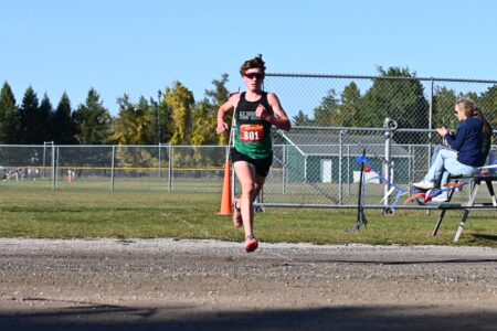 News Photo by Leslianne Johns Sophomore Xander Allen placed first, setting a new course record of 16:42.9 in Tuesday's inaugural home meet at Alpena's new cross country course.