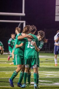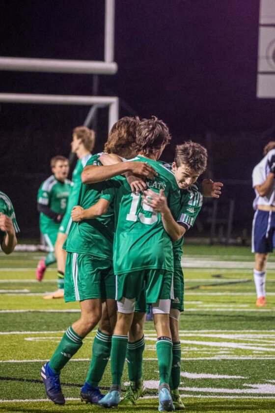 News Photo by Emily VanHorn Wildcat teammates celebrate on Thursday after Lucas Thomson scored a goal in their win over Petoskey.