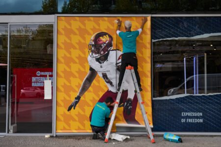 A worker pastes a poster on the facade of the renovated Santiago Bernabeu stadium ahead of an NFL regular-season game between the Washington Commanders and the Miami Dolphins in Madrid, Spain, Tuesday, Nov. 11, 2025. (AP Photo/Bernat Armangue)