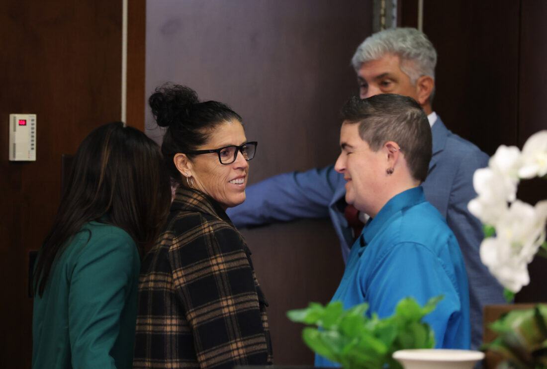 Tyler Skaggs mother, Debbie Skaggs, center, smiles in court after a settlement was reached in the wrongful death lawsuit by the family of pitcher Tyler Skaggs against the Los Angeles Angels in Orange County Superior Court in Santa Ana, Calif., Friday, Dec. 19, 2025. (Allen J. Schaben/Los Angeles Times via AP, Pool)
