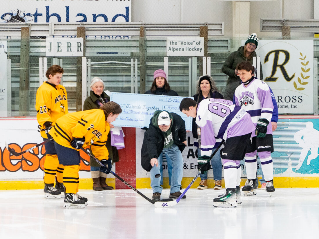 News Photo by Steve Jakubcin Representatives from Friends Together take part in a ceremonial puck drop during the Alpena High School hockey game on Friday.