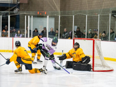 News Photo by Steve Jakubcin An Alpena High School hockey player prepares to put a shot into the net during the Wildcats 5-1 win over Cadillac at the Northern Lights Arena in Alpena on Friday.