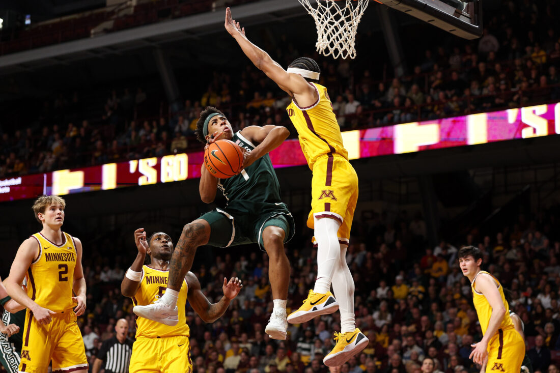 Michigan State guard Jeremy Fears Jr., left, goes up for a shot as Minnesota guard Isaac Asuma (1) defends during the second half of an NCAA college basketball game Wednesday, Feb. 4, 2026, in Minneapolis. (AP Photo/Matt Krohn)