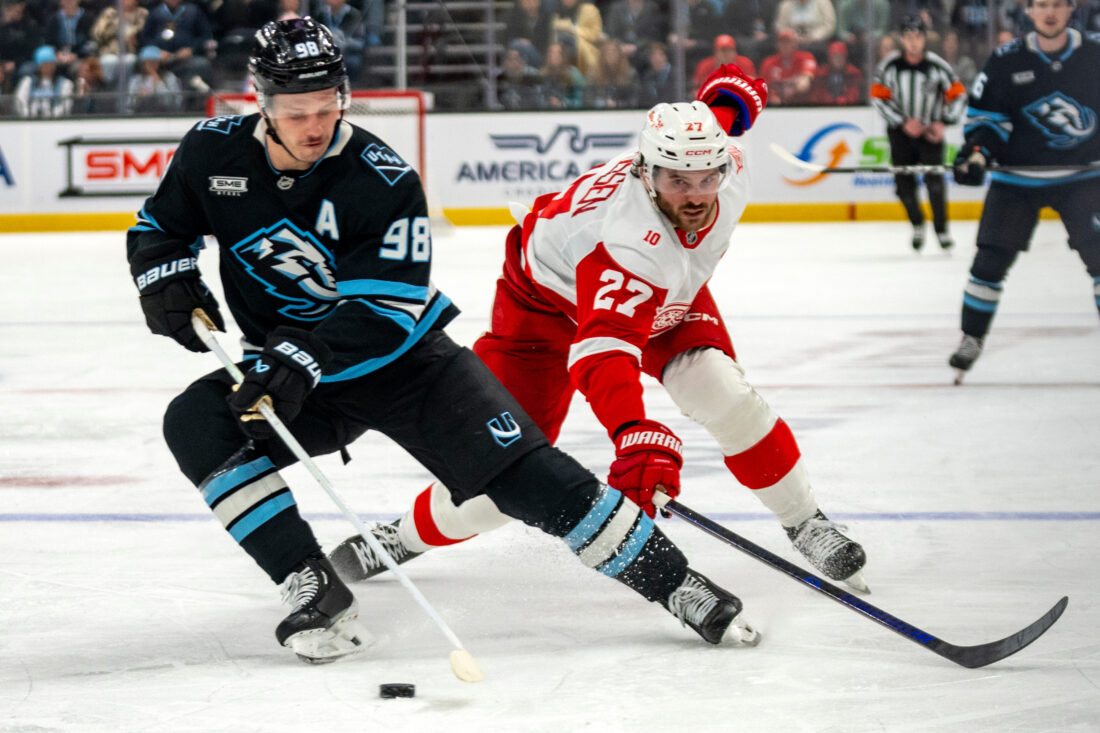 Detroit Red Wings center Michael Rasmussen (27) goes for the puck along with Utah Mammoth defenseman Mikhail Sergachev (98) during the second period of an NHL hockey game, Wednesday, Feb. 4, 2026, in Salt Lake City. (AP Photo/Rick Egan)