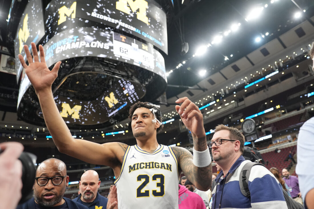 Michigan's Yaxel Lendeborg (23) celebrates after defeating Tennessee in the Elite Eight of the NCAA college basketball tournament, Sunday, March 29, 2026, in Chicago. (AP Photo/Erin Hooley)