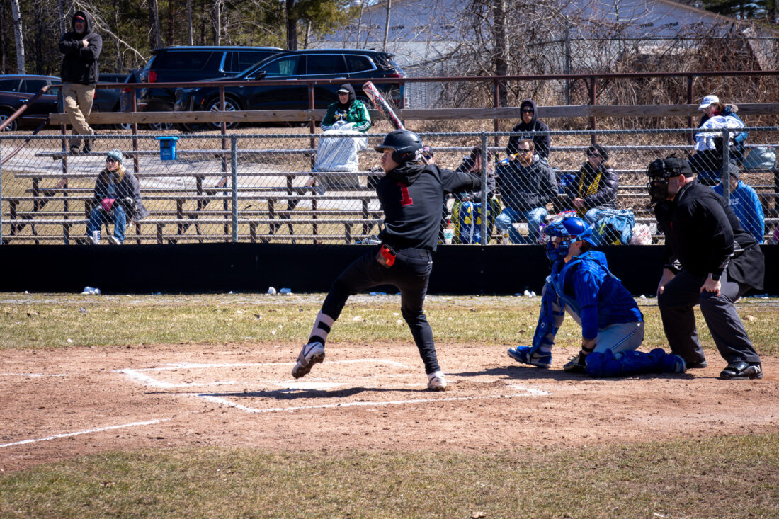 Courtesy photo Alpena Community College sophomore Maxwell McCarty swings at a pitch during the team's home opener against Bay College.