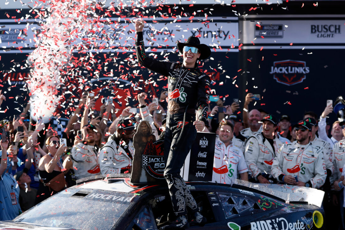 During a daring victory lap that bordered on dangerous, Hocevar piloted his No. 77 Chevrolet while hanging out the window. He enthusiastically slammed the car’s roof and saluted the crowd as he rolled down the Talladega Superspeedway frontstretch and performed a burnout.