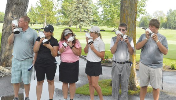 - News Photo by James Andersen River’s Edge Golf Club and Alpena Golf Club co-hosted the 50th annual City Open this weekend and winners were crowned in a half dozen different flights. Tom Lahner (men’s championship flight), Courtney Nunneley (women’s first flight), Tammy Sobeck (women’s first flight net), Brynna Smith (women’s second flight), Trevor Trevor Clissold (men’s second flight) and Zach Ross (men’s first flight) kiss their trophies after winning their respective flights.