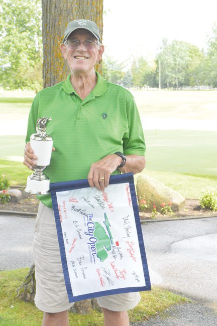 News Photo by James Andersen Bill Yahne holds his trophy and a commemorative flag after winning the men's senior flight.