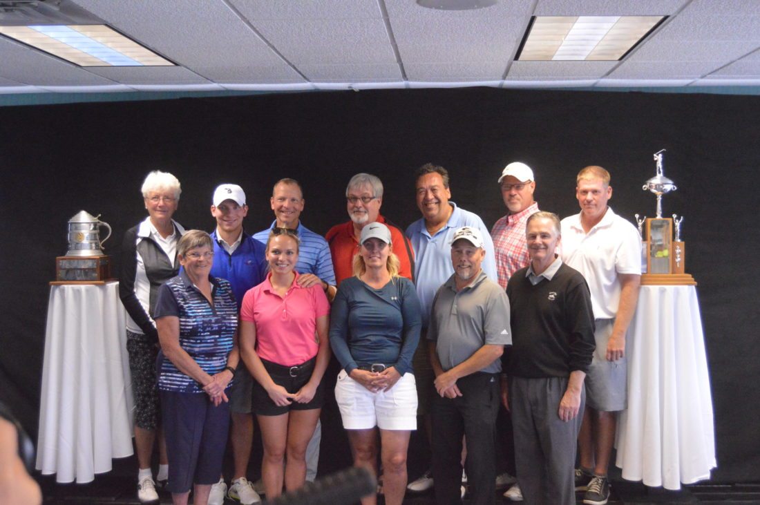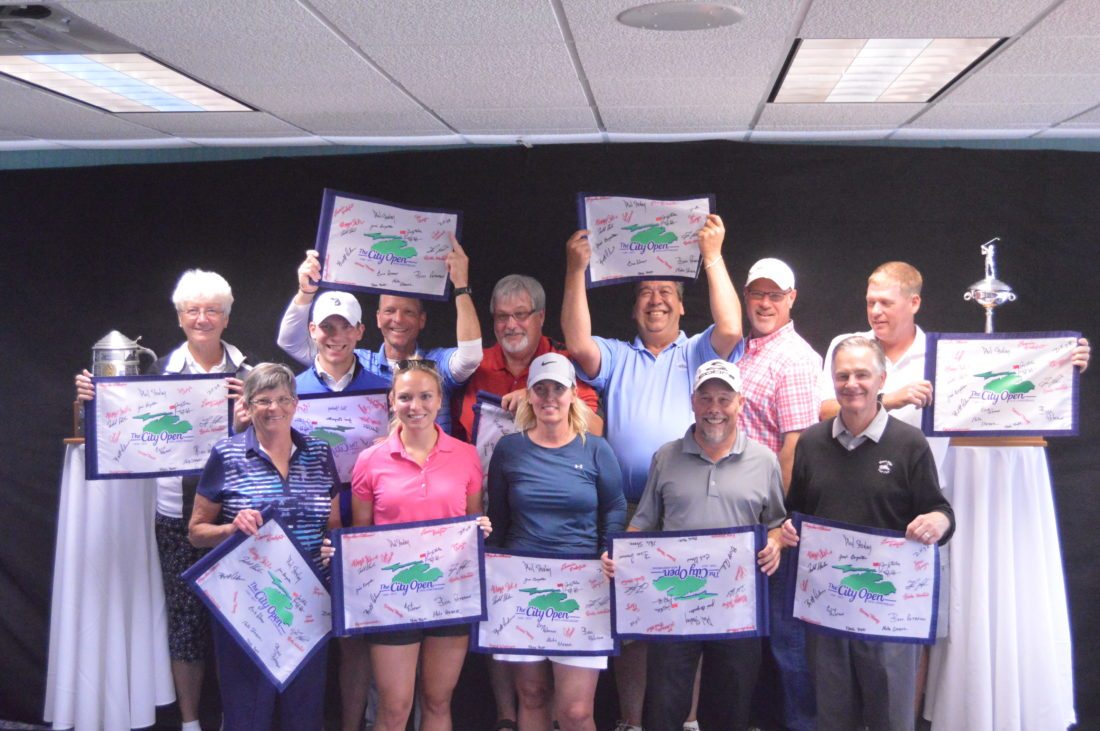 - News photo by James Andersen The 50th annual City Open began Saturday at River’s Edge Golf Club. After the first round, a small ceremony was held in commemoration of the event’s 50th year and organizers and former champions were recognized. Former champions in attendance included Gisela Schreier, Tyler Skiba, Jerry Skiba Jr., Bill Peterson, Dave Karschnick Jr., Tom Lahner, Brett Anderson, Mary Sue O’Brien, Maggie Skiba, Sue Geyer, Todd Skiba and Phil Straley.