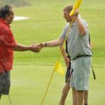 News Photo by James Andersen Dave Karschnick Jr., left, shakes hands with Tom Lahner after finishing the final round of the City Open on Sunday at Alpena Golf Club.