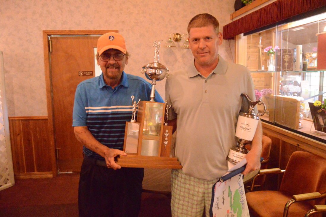 - News Photo by James Andersen Men’s City Open winner Tom Lahner poses with longtime tournament organizer Dave Karschnick Sr. on Sunday at Alpena Golf Club.