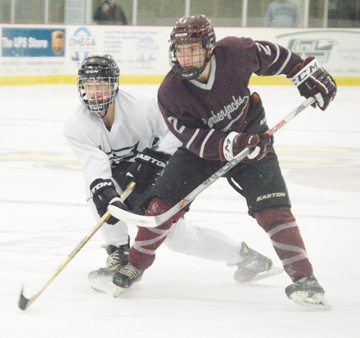 News Photo by James Andersen Alpena Community College defenseman Wade Roznowski (2) races toward the puck with a University of Indianapolis defender during a hockey game on Saturday at Northern Lights Arena.
