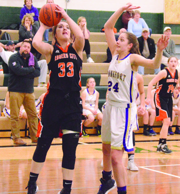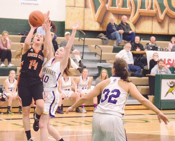 News Photo by Jonny Zawacki Rogers City's Taylor Fleming (33) scores underneath the hoop while being defended by Frankfort's Abby Hodge (24).
