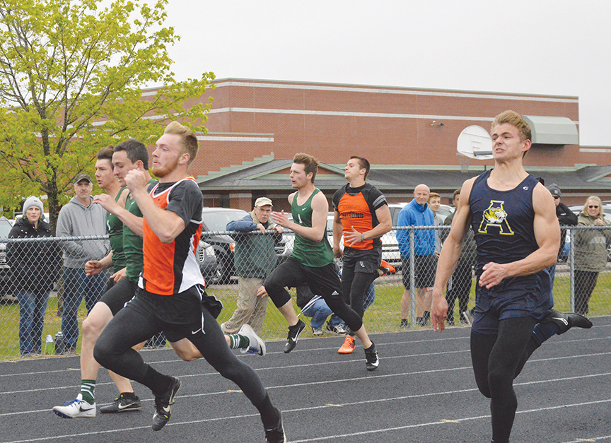 News Photo by James Andersen Hillman’s Gunner Mellingen, center, tries to separate from the pack during the boys 100 dash at the 16th annual Alpena News Track and Field Honor Roll Invitational on Tuesday at Thunder Bay Junior High School. Also pictured is race winner Kody Bertrand of Alpena, Alpena’s Zach Schaedig, Alpena’s Dylan Fleck, Rogers City’s Luke Tulgestke and Alcona’s Elliot Dubuque.