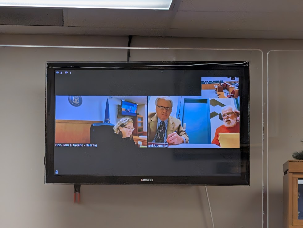 News Photo by Reagan Voetberg Attorney Bill Pfeifer and Charles Waldroup appeared via Zoom at the 88th District Court in Montmorency on Friday.