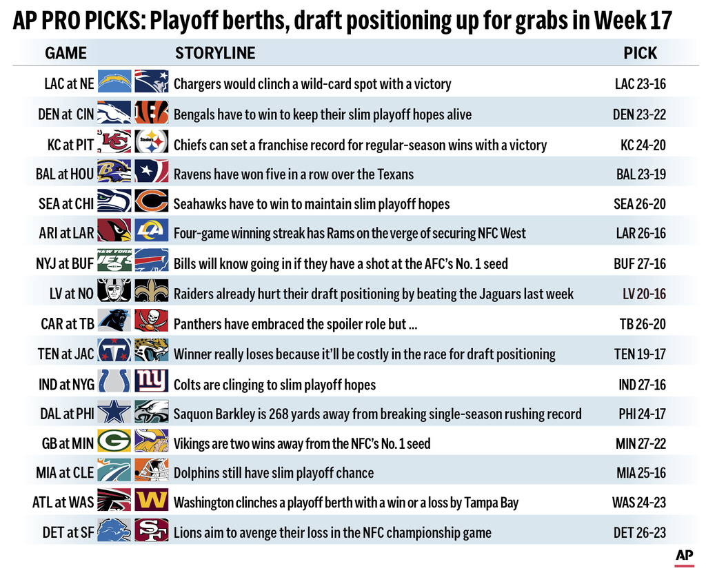 Graphic shows NFL team matchups and predicts the winners in Week 17 action.