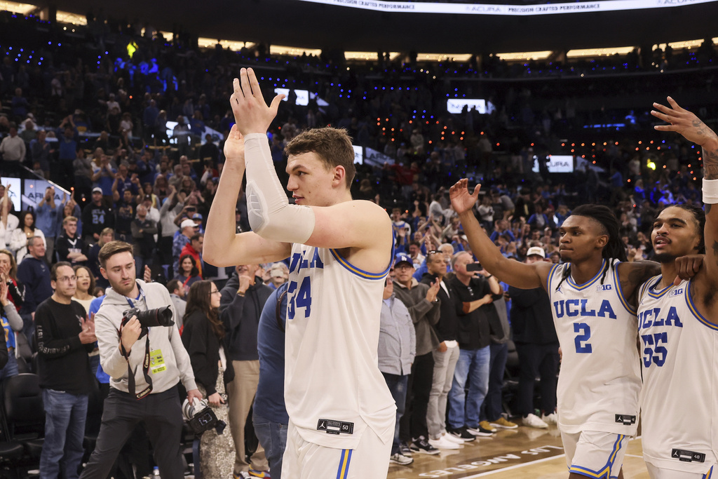 UCLA's Tyler Bilodeau, front left, celebrates near teammates Dylan Andrews (2) and Skyy Clark, right, after an NCAA college basketball game against Gonzaga, Saturday, Dec. 28, 2024, in Los Angeles. (AP Photo/Etienne Laurent)