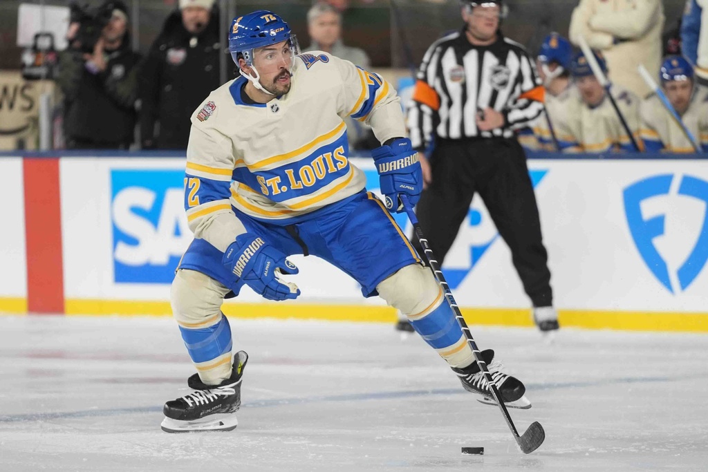 St. Louis Blues defenseman Justin Faulk (72) handles the puck during the second period of the NHL Winter Classic outdoor hockey game against the Chicago Blackhawks at Wrigley Field, Tuesday, Dec. 31, 2024, in Chicago. (AP Photo/Erin Hooley)