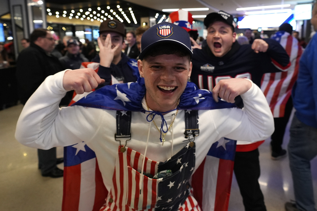 United States fans rally prior to the 4 Nations Face-Off championship hockey game against Canada, Thursday, Feb. 20, 2025, in Boston. (AP Photo/Charles Krupa)