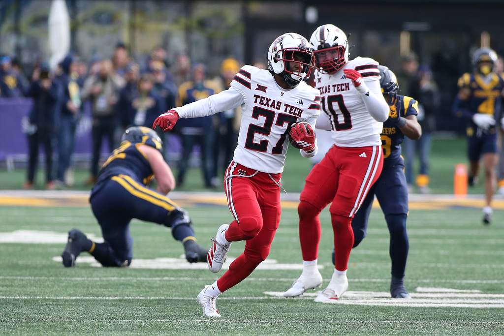 Texas Tech cornerback Amier Boyd (27) intercepts the ball against West Virginia during the second half of an NCAA college football game Saturday, Nov. 29, 2025, in Morgantown, W.Va. (AP Photo/Kathleen Batten)